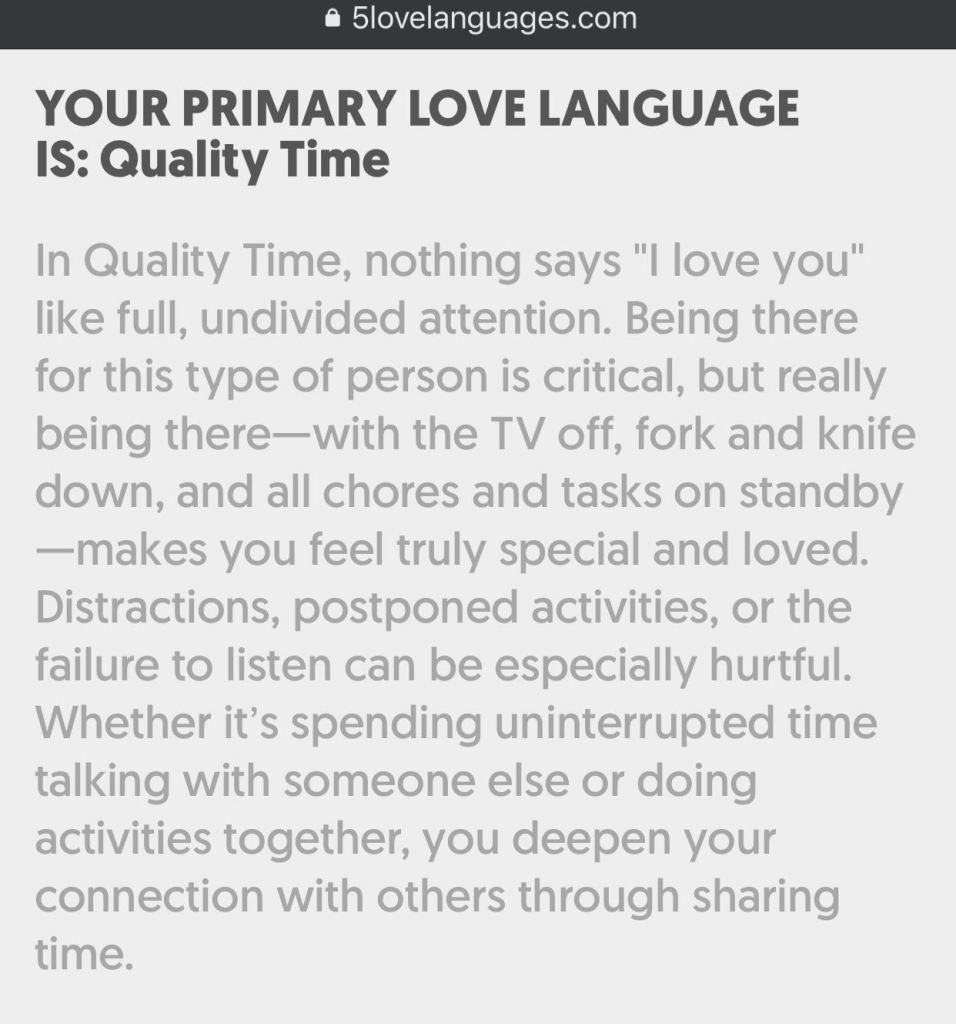 The 5 Love Languages Test is something I stumbled across recently. Give it a go if you have nothing better to do this weekend. Mine is quite accurate, quality time is an absolute essential for me.