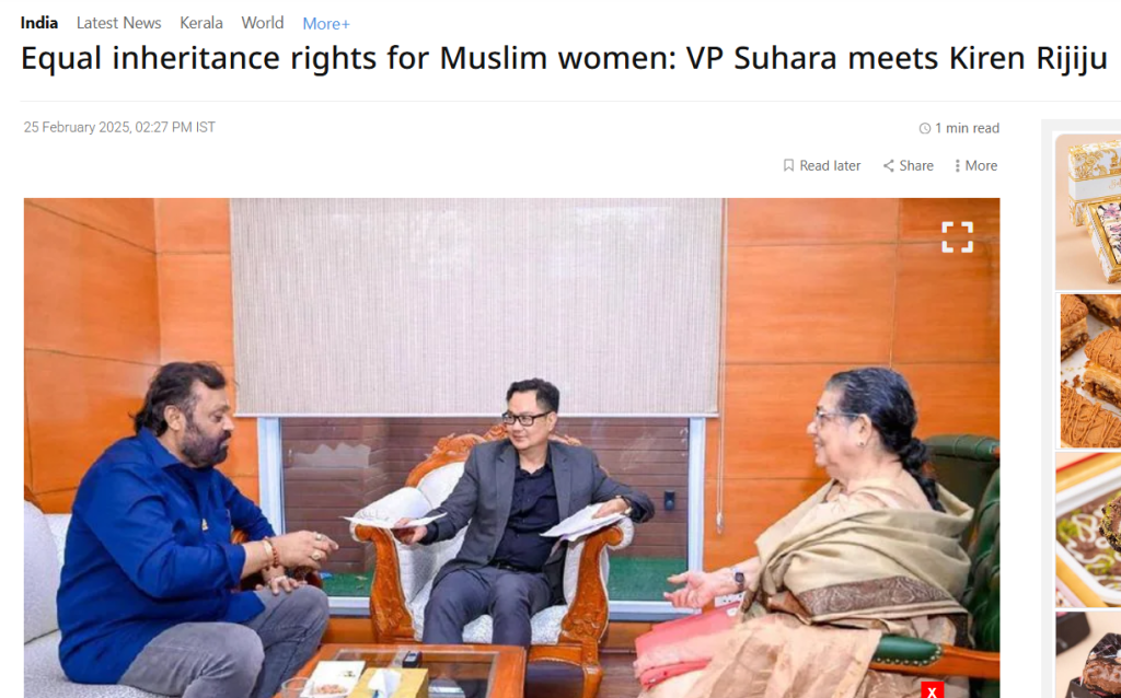 Social activist and NISA founder V.P. Suhara met Indian Minister Kiren Rijiju to demand equal inheritance rights for Muslim women in India, similar to those of Muslim men. Actor and BJP leader Suresh Gopi was also present at the meeting.