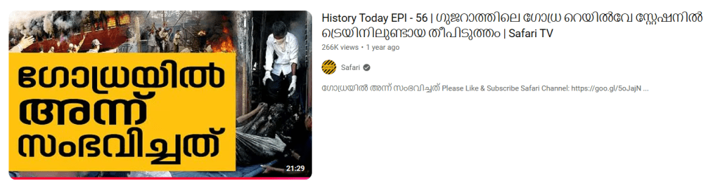 For Malayalees who prefer not to watch The Sabarmati Report, I recommend a documentary on YouTube by the Sanchari channel. It’s in Malayalam and provides a detailed account of the Godhra train burning. I am attaching a screenshot of the video below.