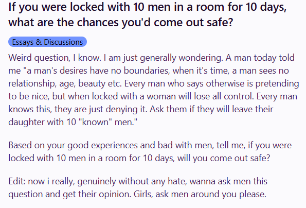 The real problem arises when that choice is taken away from us, and the men we are to be locked up with, whether known or unknown, are chosen by someone else. When that happens, the chances of discomfort or even unsafe situations naturally increase.
